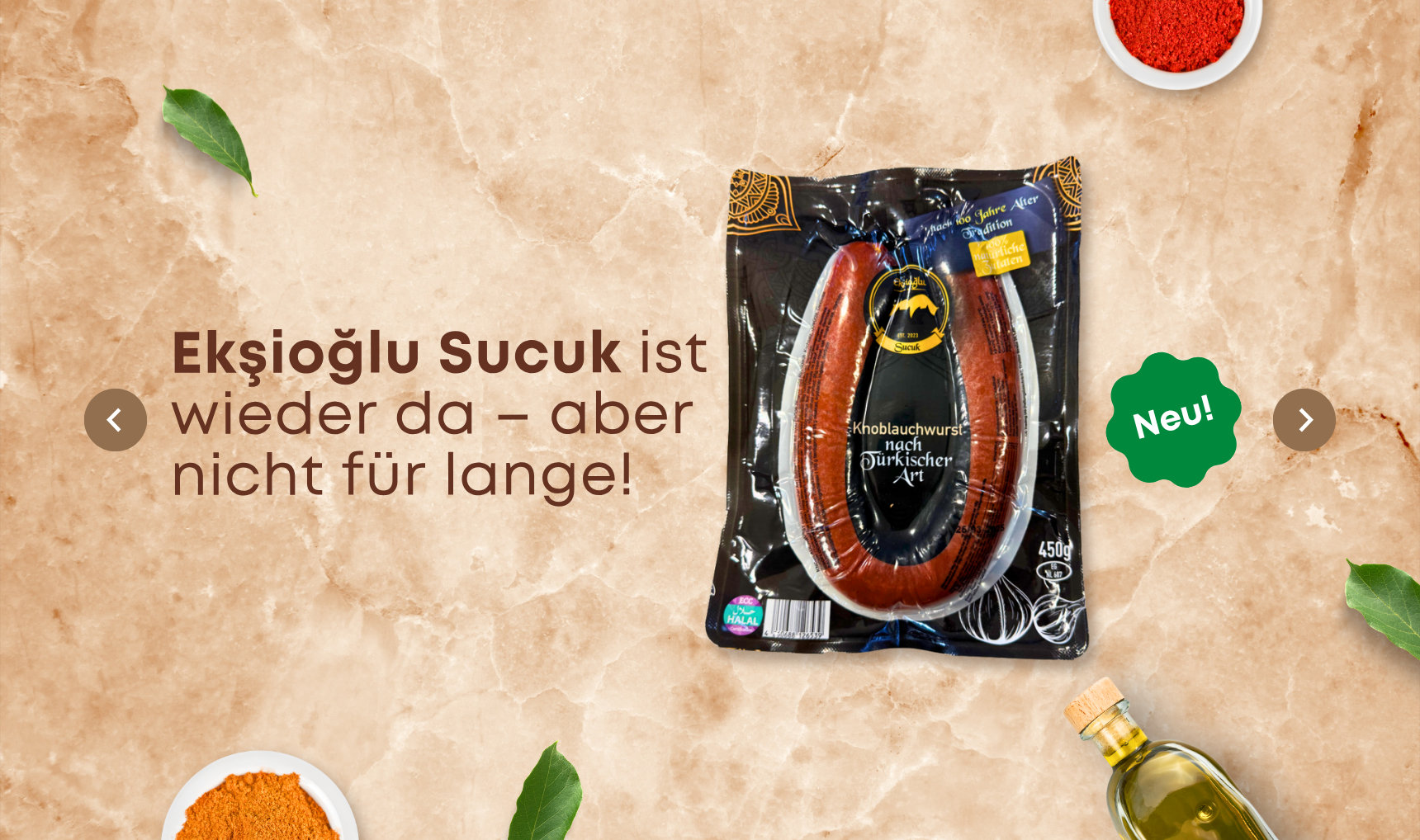 Beginnen Sie durch Ihren Online Markt Ihre kulinarische Reise mit unseren hochwertigen Grundnahrungsmitteln. Von erstklassigen Getreideprodukten über frische Milchprodukte bis hin zu köstlichen Fleischprodukten wie Sucuk - bei Ihrem Online Lieferdienst können Sie einfach alle Lebensmittel online kaufen, um Ihre Küche mit den besten Zutaten zu füllen. Ihr türkischer Einkaufsladen ist also nunmehr online erreichbar. Jetzt orientalische Lebensmittel online kaufen und den Geschmack in vollen Zügen genießen!