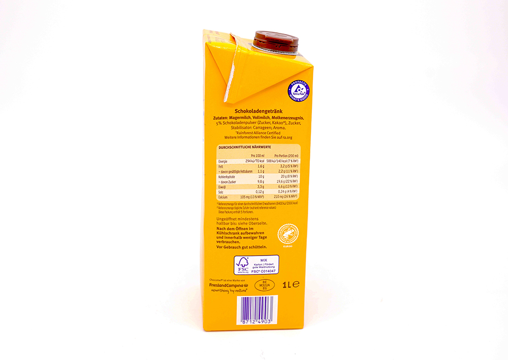 Zutaten (Magermilch),Vollmilch,Molkenerzeugnis,5% Schokoladenpulver ((Zucker, Kakao)),Zucker,Stabilisator (Carrageen),AromaAllergen Information